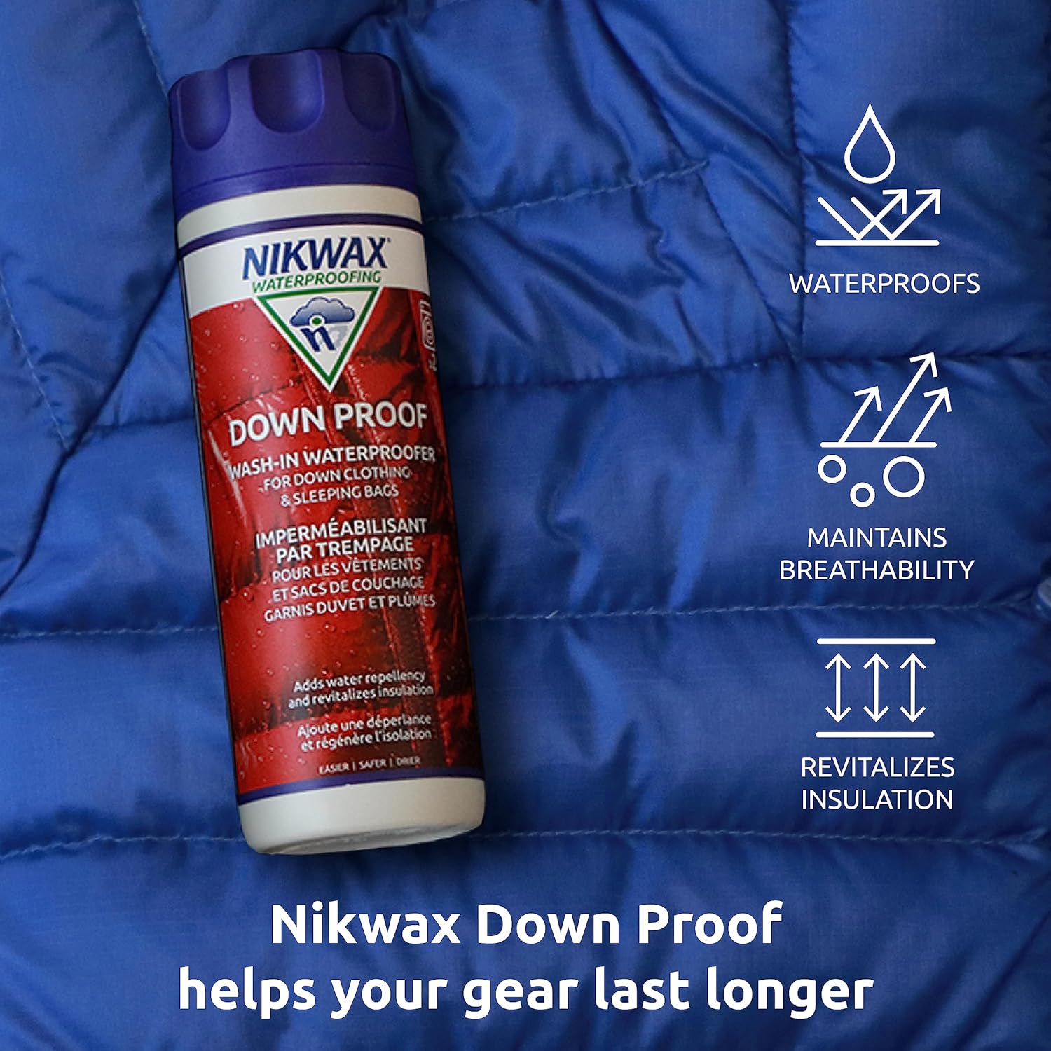 Nikwax Down Proof™ é uma impermeabilização especializada, sem PFAS, desenvolvida para proteger as propriedades isolantes do equipamento com enchimento em penas (down) em condições húmidas e molhadas. Fácil de aplicar na máquina de lavar ou à mão, não é inflamável e ajuda a manter casacos, coletes e sacos-cama de penas quentes, leves e respiráveis – mesmo em aventuras exigentes ao ar livre.